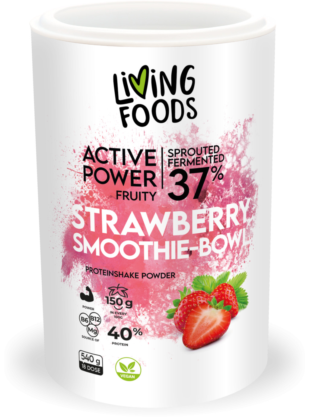 rizs fehérjepor, csíráztatott barnarizs liszt*, fermentált barna rizskorpa, kendermag fehérjepor, borsó fehérjepor, eper por*, vitamin és nyomelem premix [maltodextrin, kálium-citrát, kalcium-karbonát, magnézium-citrát, dikalcium-foszfát, aszkorbinsav, vas-fumarát, tiamin, riboflavin, niacin, kalcium-pantotenát, piridoxin-hidroklorid, D-biotin, folsav, cianokobalamin, D-alfa-tokoferol-acetát, retinol-acetát, kolekalciferol], eper aroma, chia mag (aztékzsályamag - Salvia Hispanica)*, emulgeáló szer (xantán gumi), eper darabok, málna por*, édesítőszer (steviol-glikozidok), savanyúságot szabályozó anyag (citromsav), citrus aroma, nyomelemek inaktivált élesztőben (Zn, Se), bifido- és lactobacilus kultúrák, gyümölcs színezék, réz